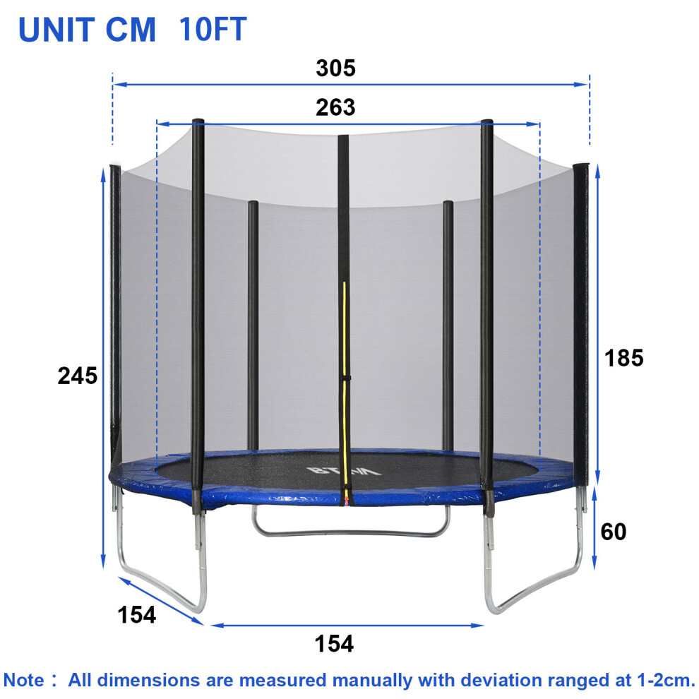 Outdoor Workout PartnerOur trampolines with enclosure package provide different dimension of 6ft, 8ft,10ft,12ft and 14ft. All trampolines give you an ample amount of room to bounce on. This outdoor trampoline's a big fun factor for kids, adults and is perfect for relieving stress and working out your body, promoting stamina, motor skills.Fully Considered SafetySteel U-Shaped Legs manufactured with rust-resistant galvanized steel (40 x 1.5mm), the U-shaped base leg system firmly stabilizes and supports the entire trampoline from every angle for your safety, user weight up to 100 kg (for 6FT max.50 kg. 6 foam-padded safety poles prevents accidentally hitting.Durable ServiceHeavy-Duty bounce mat is manufactured with high UV protection from polypropylene, increasing strength, and designed to last for years to come outdoors, comes with a safeguard thick foam covering pad. Fully equipped trampoline designed for premium safety, quality bouncing, and durability.High-Quality StructureHigh-quality springs evenly distribute the weight, provide safe cushioning and excellent elastic force. Premium steel rust-resistant net support poles are highly durable connected with steel joint bonding in 2 areas for unmovable support preventing structural twisting and securely holding up the safety net.Fully Equipped & Friendly AssemblyAll Accessories Included - Premium UV protected bounce mat, heavy duty galvanized steel ladder, netted safety enclosure,spring pulls and necessary tools. Designed for user-friendly assembly with no drilling required. 6ft / 8ft is for kids and the 10/12ft are more designed for teenagers and adults, while the 14ft is better for family.